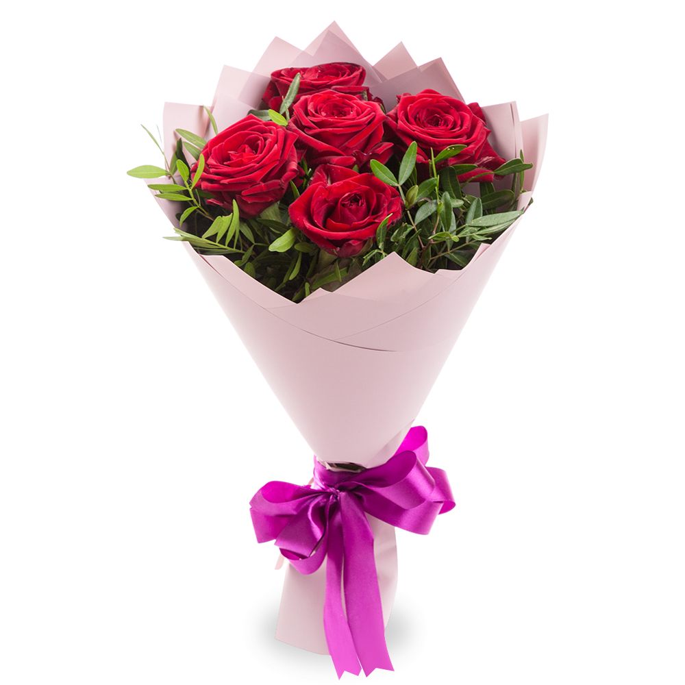 Изысканный букет из 5 красных роз с нежной фисташковой зеленью — идеальное сочетание страсти и свежести. Компактный, но выразительный подарок для особых моментов. Свежие цветы с доставкой в Абазе.