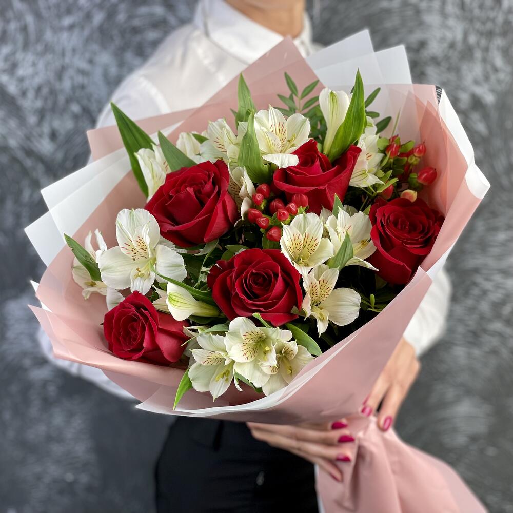 Элегантная композиция из 5 красных эквадорских роз и 4 белых альстромерий с добавлением фисташковой зелени и гиперикума. Изысканный подарок для особых моментов. Заказ цветов с доставкой на дом Абаза.