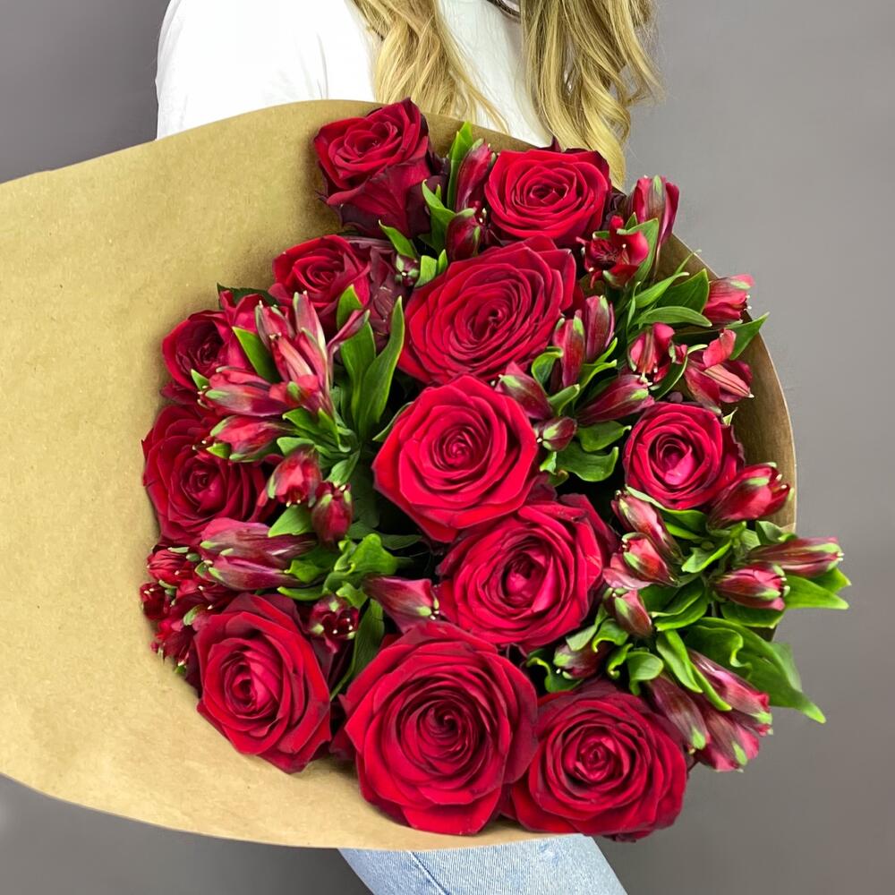 Элегантная композиция из 13 роскошных красных роз и 8 нежных альстромерий — идеальное сочетание страсти и преданности. Заказать букет цветов с доставкой в Абазе.