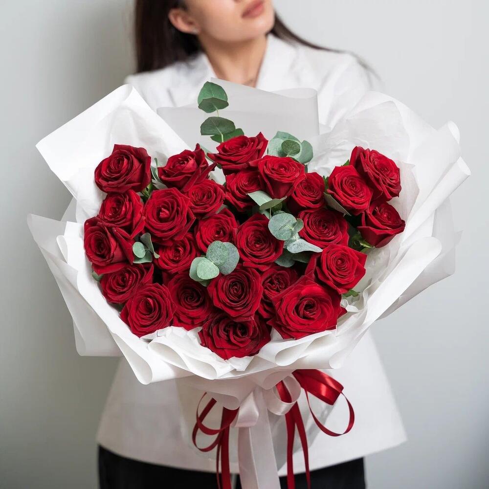 Элегантная композиция из 25 свежих красных роз с серебристыми веточками эвкалипта — воплощение страсти и изысканности.